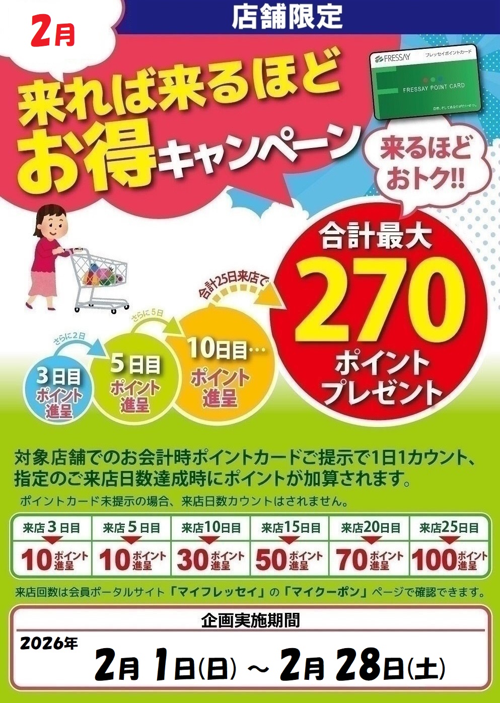 実施期間中の来店回数に応じて 条件達成時にフレッセイポイントをプレゼント!