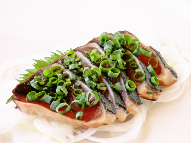 春の「初ガツオ」は脂が少なくあっさりとしているのが特徴です。たたきにして、旬の新玉ねぎやたっぷりの薬味を添えてさっぱりと召し上がってみてはいかがでしょうか。