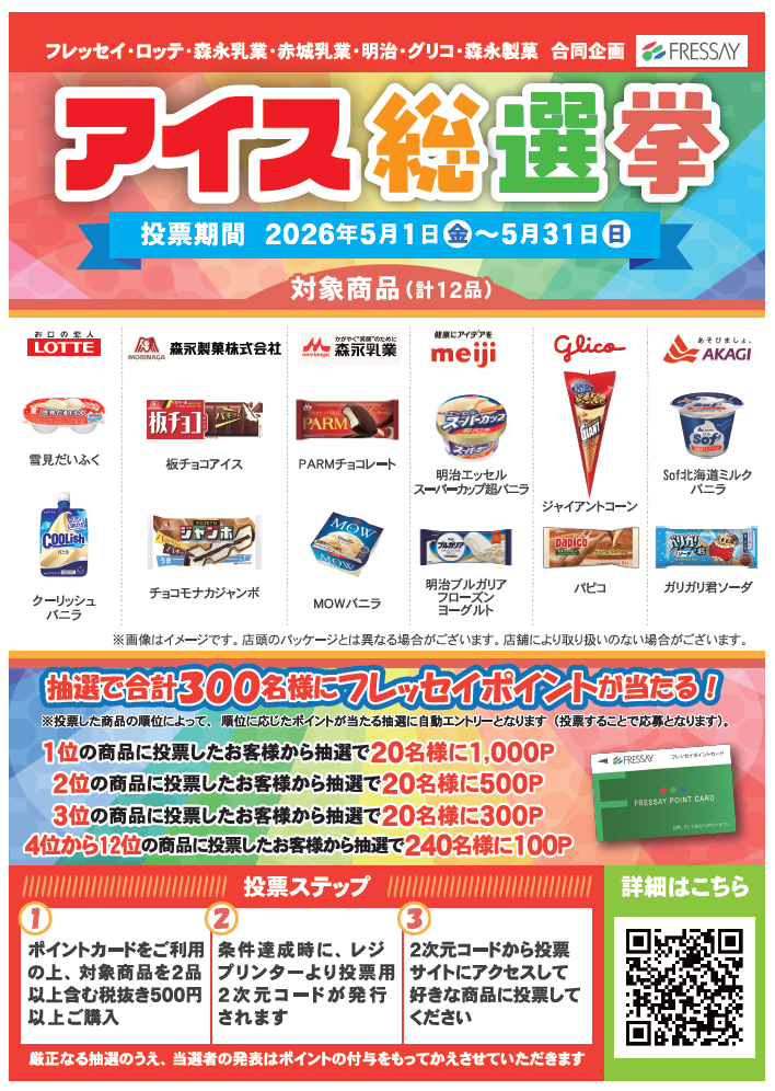 アイス総選挙に投票すると抽選で合計300名様にフレッセイポイントが当たる!