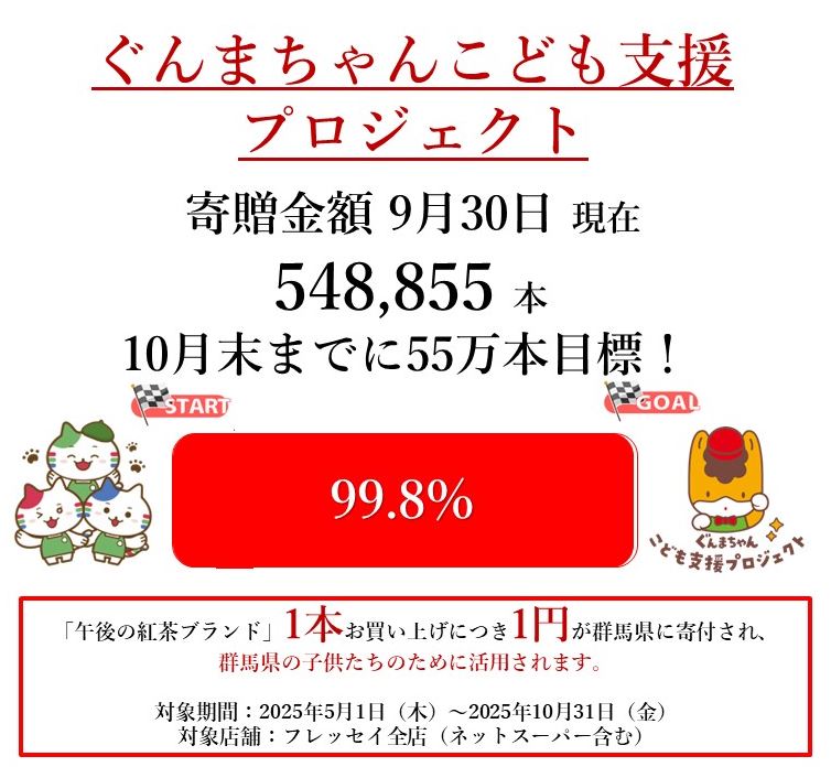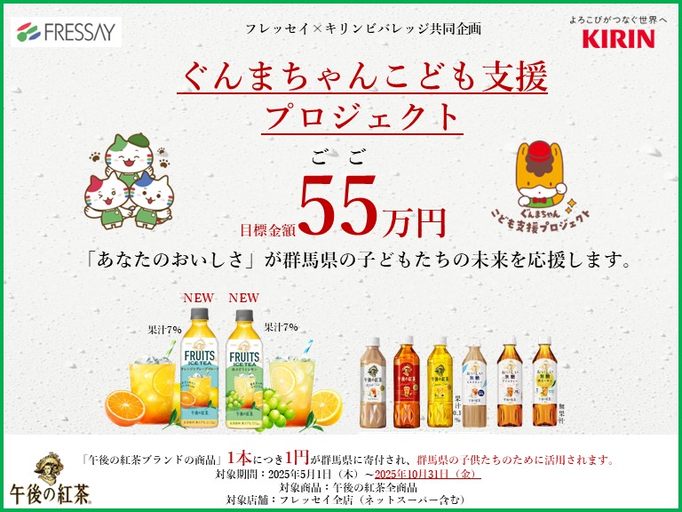 「午後の紅茶ブランド」1本お買い上げにつき1円が群馬県に寄付され、群馬県の子供たちのために活用されます。