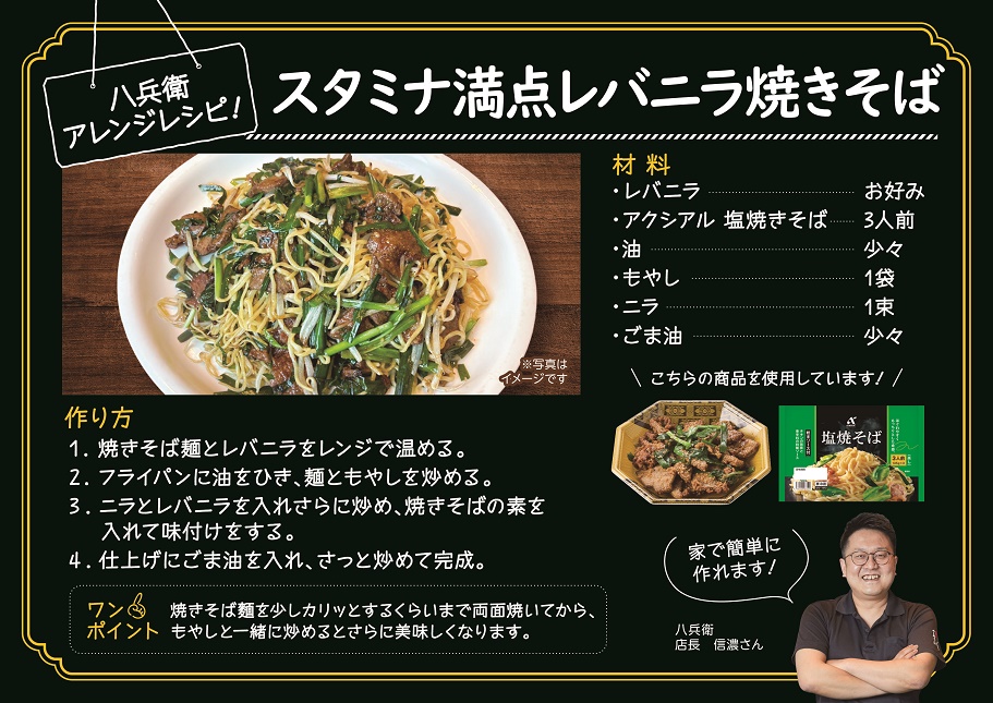 フレッセイの「レバニラ(惣菜)」と「アクシアル塩焼きそば(デイリー)」にひと手間加えて、自作風に大変身! 八兵衛考案の思わず食べたくなるアレンジレシピをご紹介させていただきます。