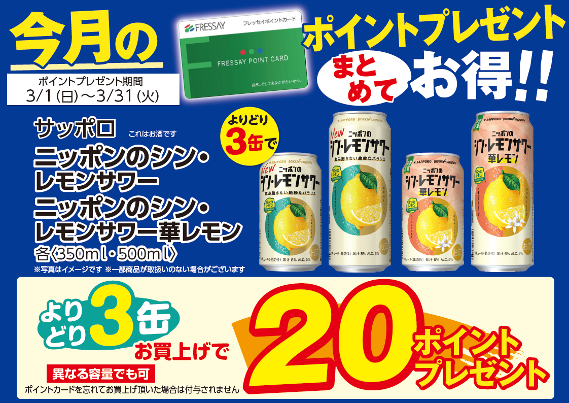 3月1日~3月31日まで フレッセイにてサッポロ「ニッポンのシン・レモンサワー350ml/500ml缶」「ニッポンのシン・レモンサワー華レモン350ml/500ml缶」3缶お買い上げごとに20ポイントプレゼント!