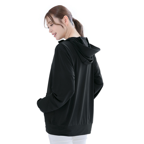 つば幅約9cmのフード付きで日差しをガード!お尻まですっぽりのロングタイプでゆったり着用できます。親指が出せる指出し穴付きで、気になる手の甲もガードします。